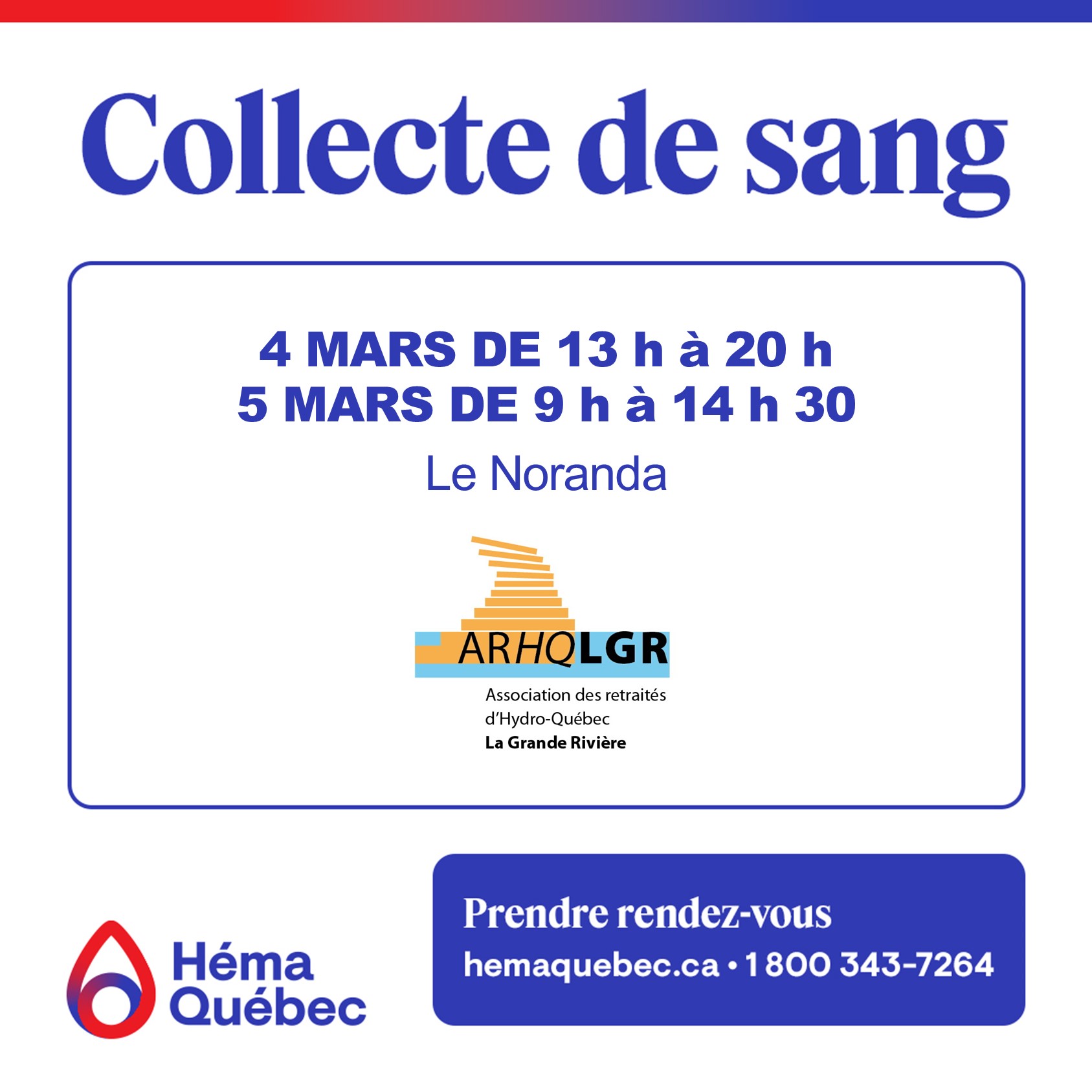 LA GRANDE COLLECTE DE SANG de l’ASSOCIATION DES RETRAITÉS D'HYDRO-QUÉBEC LA GRANDE RIVIÈRE Mercredi 4 mars de 13h à 20h…