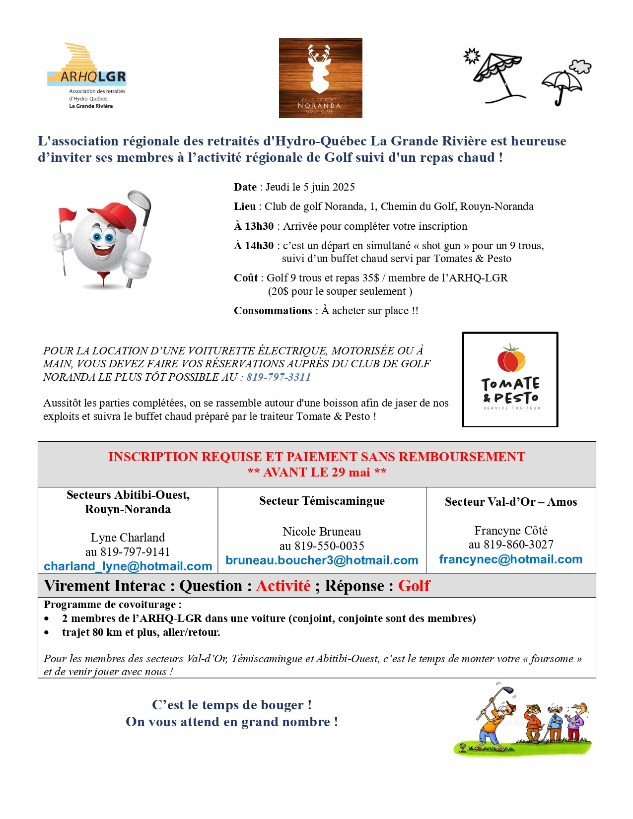 L’association régionale des retraités d’Hydro-Québec La Grande Rivière est heureuse de vous inviter à l’activité régionale de Golf suivi d’un Buffet chaud !