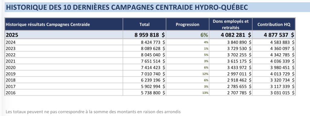 À titre comparatif, voici un historique des 10 dernières années de campagnes Centraide d`Hydro-Québec :